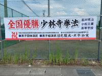 先日、全国優勝を記念して、横断幕を作成しました。本校テニスコート裏に掲示しています。