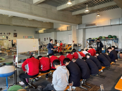 午後には、職業支援を行う会社「スポーツフィールド」の方に、キャリア教育講座を開講していただき、スポーツに取り組む学生の社会から期待されているポイントや大学進学の優れた側面などを聞きました。