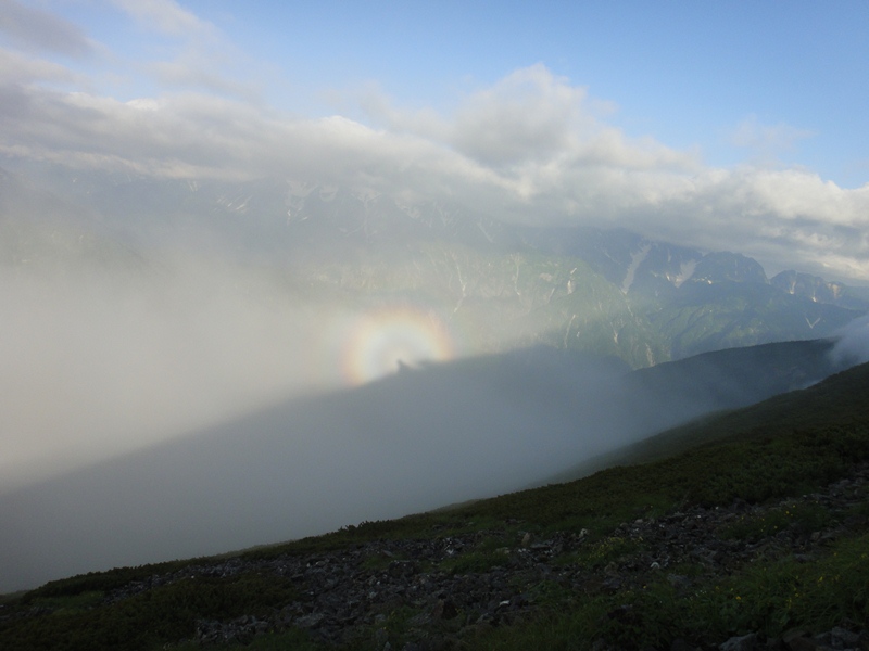 最後にこちらは鹿島槍ヶ岳を下山してすぐ見られたブロッケン現象です。虹の輪っかみたいになっているのわかります?これは霧がスクリーンになって自分の影が映るとても珍しい現象なのです。周りの虹は光の乱反射によるものらしいです。ご利益ありそうだったのでお願い事しました。ご利益あるかはわかりませんが。
