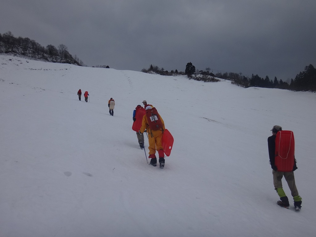 山頂の展望台に着きました。山頂付近では雪が積もっており、ここからザックにつけていたソリで一気に下山します。