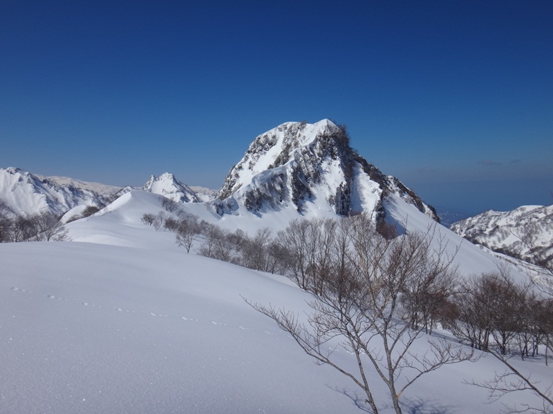 そしてこれが昼闇山ですが、気温が高くて雪崩の危険性があったので今回は景色のいいピークまでです。景色を見ながら昼飯タイムに入ります。