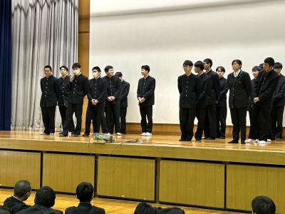 送辞では、在校生を代表して、判 太登さんから卒業生に向けてお祝いのことばが送られ、答辞では、卒業生を代表して北出芽衣さんが在校生、職員、保護者に向けて感謝の気持ちが伝えられました。最後に全員で校歌を斉唱し、式を閉じました。