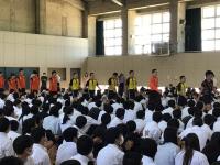 5月18日(木)、1学期中間考査、最終日に本校体育館において総体、総文の壮行式が行われました。各部の代表生徒が入場し、ステージ上に集結。学校長、生徒会長から激励の言葉が送られた後、各主将が大会日程や対戦相手、大会に向けた意気込みを全校生徒に述べました。4年ぶりに応援団が主体となり、全校生徒で校歌、応援歌を歌い、三三七拍子で代表生徒に対してエールを送りました。また、会の最後には各部を代表して、卓球部主将の弘灰さんが決意表明と壮行式開催のお礼を述べました。