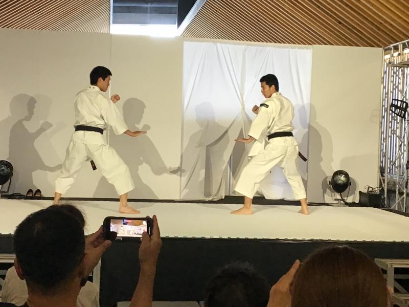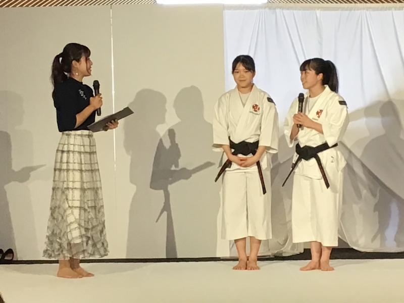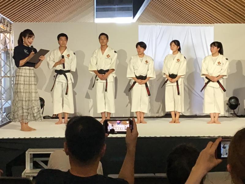 9月18日 小松駅高架下に小松市観光交流センター(Komatsu九)がオープ 最初に組手の披露を行い、女子単独演武、女子組演武、男子組演武を行った。 それぞれの演武終了後に司会者からのインタビューもあった。部員は緊張の中、一生懸命答えていたのが印象的でした。