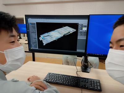 この授業では、ドローンで上空から撮影した画像をコンピュータで解析処理(点群処理という)を行い、地形の様子を3次元データに変換した結果を確認しました。