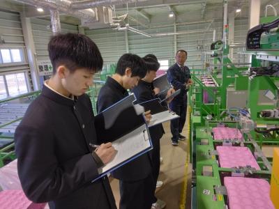 JA小松市さんのご協力をいただき、電気科の3年生4名が小松市向本折町にあるJA小松市 野菜総合集出荷場の見学をしました。工業高校では3年生になると1週間に3時間、課題研究という科目があり、その一環で見学をしました。