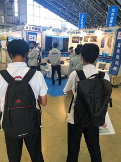 生徒はまずセミナー会場で地元小松の吉光組さんと江口組さんの企業説明を受けましたが、どちらの会社も大正時代に設立された歴史ある会社ということや常に新しい技術が使われていることなどに驚きながら聞いていたようです。質疑応答では、「仕事は楽しいですか?」という質問に対し、「仕事や人生は楽しいこともつらいこともあるが、楽しいと思えたり周りから見えるように頑張っている」と真摯な回答をしていただいていました。生徒にはどのように伝わったでしょうか?いずれにしても、地元の素晴らしい企業様から大切にされ、期待されていると肌で感じることができたのではないでしょうか。その後、生徒は解散し、会場を自由に見て回っていました。「楽しいか?」と聞いたら「楽しいです」と帰って来てまずは一安心。業界に関係する大人ばかりのこのようなイベントを、高校生のうちに見学できたことは、将来を考える上で大変刺激になったことと思います。