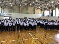5月18日(木)、1学期中間考査、最終日に本校体育館において総体、総文の壮行式が行われました。各部の代表生徒が入場し、ステージ上に集結。学校長、生徒会長から激励の言葉が送られた後、各主将が大会日程や対戦相手、大会に向けた意気込みを全校生徒に述べました。4年ぶりに応援団が主体となり、全校生徒で校歌、応援歌を歌い、三三七拍子で代表生徒に対してエールを送りました。また、会の最後には各部を代表して、卓球部主将の弘灰さんが決意表明と壮行式開催のお礼を述べました。