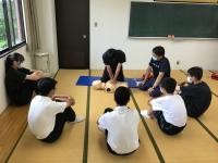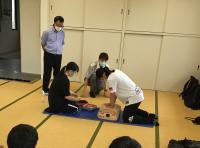 心肺蘇生法とAEDの使い方の講習を受け、参加生徒全員が緊張感を持って、真剣に取り組みました。また、熱中症の対応についても説明を受けました。生徒たちは繰り返し練習することで自信につながったようです。