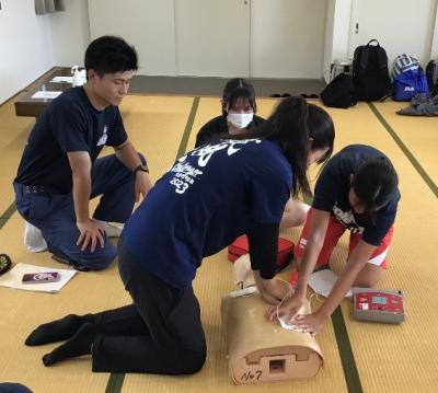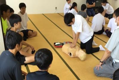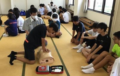 心肺蘇生法とAEDの使い方の講習を受け、参加生徒全員が緊張感を持って、真剣に取り組みました。また、熱中症の対応とけがの手当てについても説明を受けました。生徒たちは繰り返し練習することで自信につながったようです。