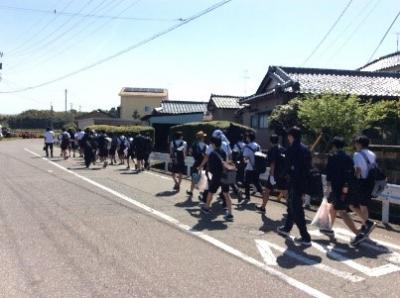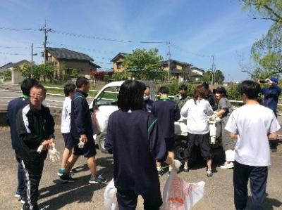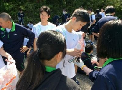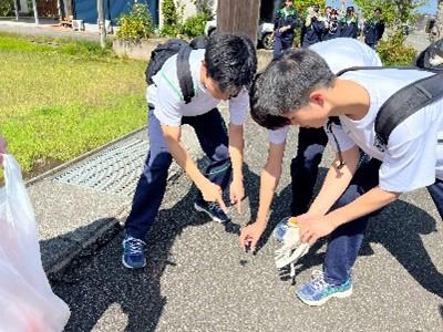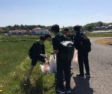 3年生は3コースに分かれ、憩いの森へ向かう往路でゴミ拾いを行いました。