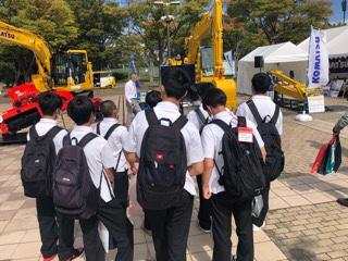 生徒はまずセミナー会場で地元小松の吉光組さんと江口組さんの企業説明を受けましたが、どちらの会社も大正時代に設立された歴史ある会社ということや常に新しい技術が使われていることなどに驚きながら聞いていたようです。質疑応答では、「仕事は楽しいですか?」という質問に対し、「仕事や人生は楽しいこともつらいこともあるが、楽しいと思えたり周りから見えるように頑張っている」と真摯な回答をしていただいていました。生徒にはどのように伝わったでしょうか?いずれにしても、地元の素晴らしい企業様から大切にされ、期待されていると肌で感じることができたのではないでしょうか。その後、生徒は解散し、会場を自由に見て回っていました。「楽しいか?」と聞いたら「楽しいです」と帰って来てまずは一安心。業界に関係する大人ばかりのこのようなイベントを、高校生のうちに見学できたことは、将来を考える上で大変刺激になったことと思います。