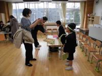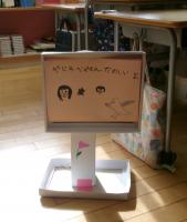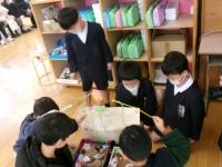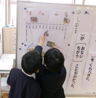 今日は、新1年生を迎える会。先輩の1年生は、学校案内や生活科でつくったおもちゃのお店など、「学校は楽しいよ」を伝える準備をしてきました。最初はちょっぴり緊張していましたが、練習通りバッチリ新1年生をエスコートできました。