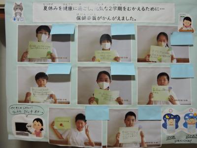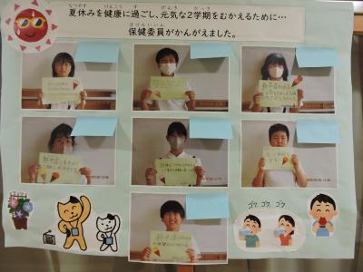 前期保健委員会のみなさんが、夏休みを健康に過ごし、2学期を元気にむかえるためのメッセージを掲示してくれました。