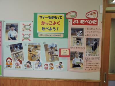 前期給食委員会のみなさんが「マナーを守ってかっこよく食べよう」のモデルをしてくれました。