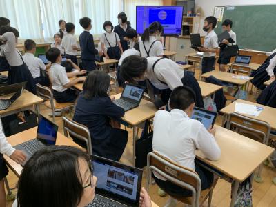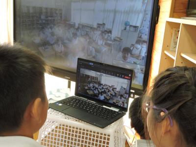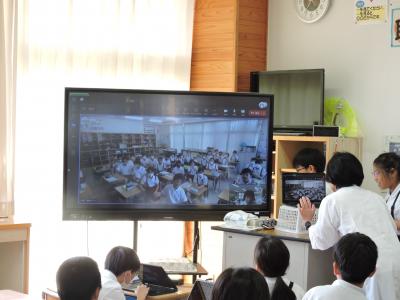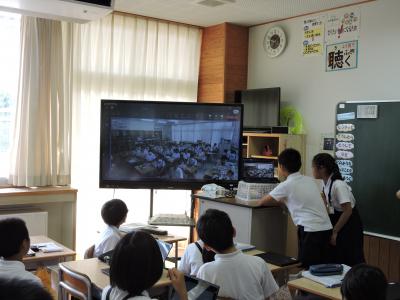 5年1組は東湊小学校の5年生と5年2組は朝日小学校の5年生と自分の学校紹介の英語交流をしました。