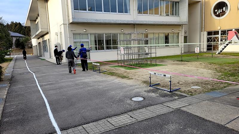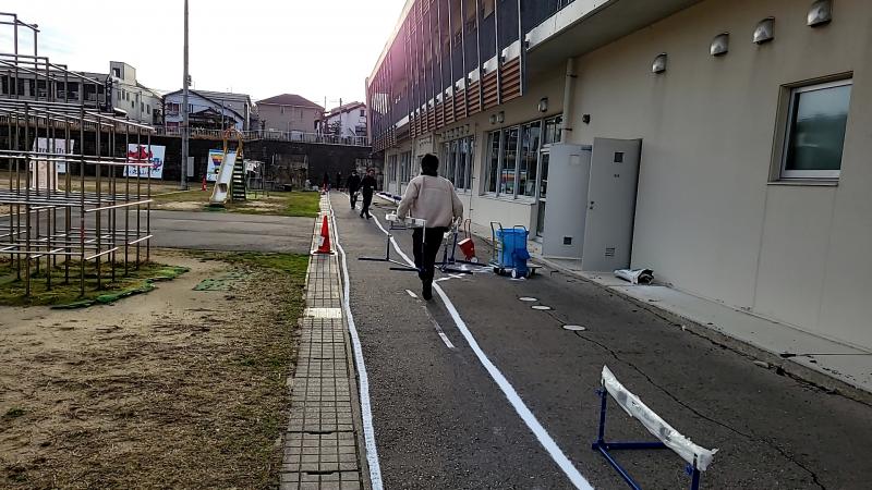 危険個所にはコーンやハードル等を設置し、通れる道をラインで示しました。学校が始まったら、みんなで確認をして、安全に過ごせるようにしていきましょう。
