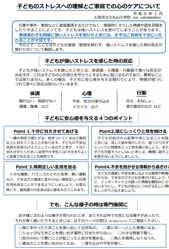 来週より小丸山小学校にサポートに来て下さる京都市教育委員会のスクールカウンセラーの方々が、「小丸山小学校向け:ご家庭での心のケアについて」の資料を作成してくださいましたので掲載します。本当にたくさんの方々のご支援に感謝です。