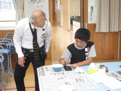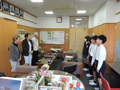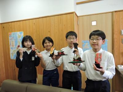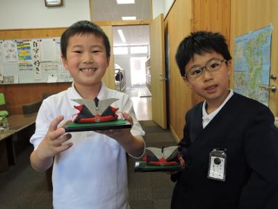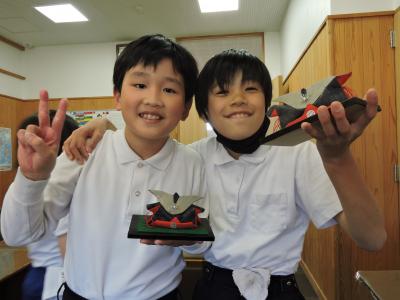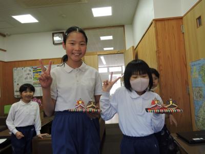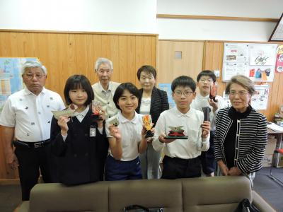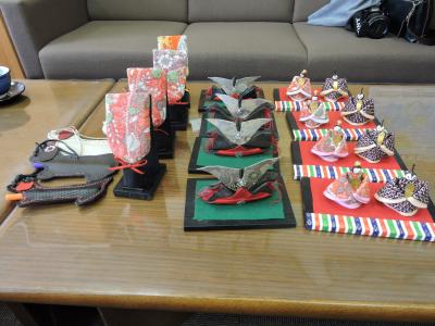 4月19日(金)岡山県から菊池さん浅原さんが来校されました。菊池さんたちは岡山県で水害に被災した時にいただいた着物の布などを使ってかぶと等を作ってくださいました。