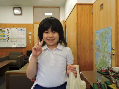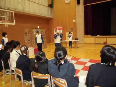 12月18日(水)には、被災地の小学生へ青組(グミ)を送る支援活動、『青組プロジェクト』のグミを届けに、東京から責任者の中村時光様が来校し、直接、児童会長に手渡してくださいました。グミはANAで販売されている物でグミには様々な方からのメッセージも添えてありました。ありがとうございます。