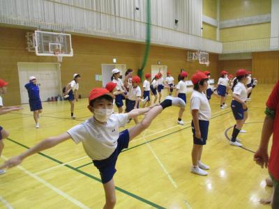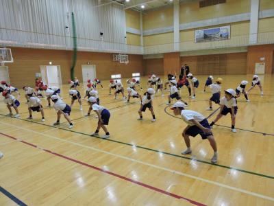 下の写真は3年生の体育です。狭いスペースでもできるストレッチや、2人組遊びで心と体をほぐしました。