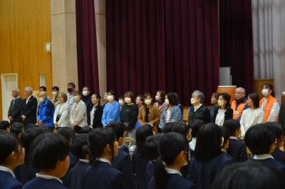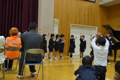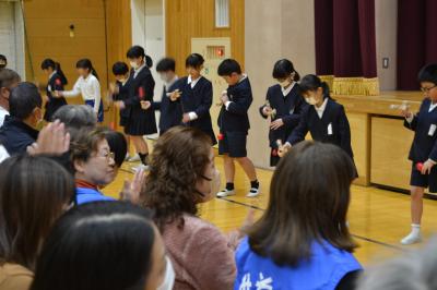小丸山っ子がお世話になっている方はたくさんいるのですが、年間を通じてお世話になっている皆さんを中心にお招きし、「ありがとう」を伝える会を開催しました。太鼓の披露、音楽に合わせたけん玉の技披露、かわいいメダルのプレゼント、そして「ありがとうの花」の歌の合唱等で、「ありがとう」の心を伝えました。この会は初めて開催したのですが、企画委員の5・6年生が司会やあいさつ等、中心となって進めてくれました。お招きした皆さんは、小丸山っ子の「ありがとう」の気持ちを感じてくださったことと思います。