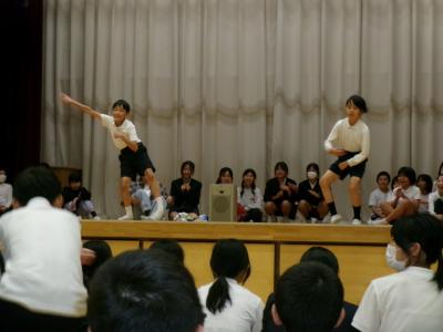 「おお~!」大変盛り上がっている声に誘われて、体育館に行くと、ノリノリの音楽とステージ上で笑顔でダンスする小丸山っ子の姿が。ダンスしている子も見ている子も、先生たちも、最高の笑顔でした!