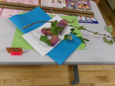 校舎裏に実った「アケビ」です。初めて見た子もいるかもしれませんね。職員が見つけて、飾ってくれました。