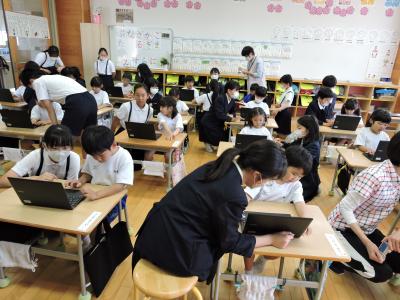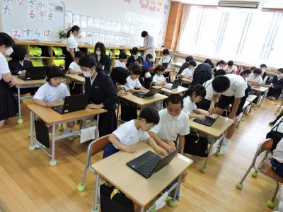 5月24日(水)1年生が6年生にお手伝いしてもらい、初めてログインしました。そして、朝顔の芽の写真を撮影しました。6年生からパソコンの持ち方やキーボードの打ち方などを丁寧に教えてもらい「ありがとう」「うれしかった」と自分で伝えることができました。