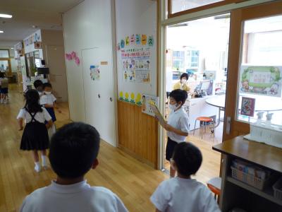 5月19日(木)のびのびになっていた学校探検がありました。2年生の案内で1年生が校内を回りました。2年生は張り切って案内していました。凛々しかったよ。