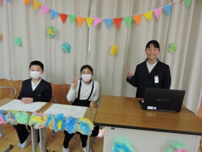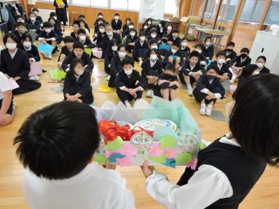 2月29日(木)テーマ『ありがとう6年生 笑顔あふれる送る会にしよう』のもと、6年生を送る会が行われました。いつもの体育館ではなく、教室やランチルームで行いました。5年生はこれまでと違うスタイルの企画運営に挑戦し、見事にやり遂げてくれました。どの学年も6年生にありがとうの気持ちをたくさん伝えることができました。6年生はその気持ちをしっかり受けとめ、素敵なお返しをしてくれました。さすが6年生‼