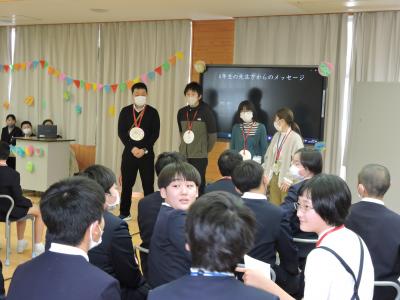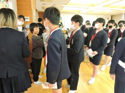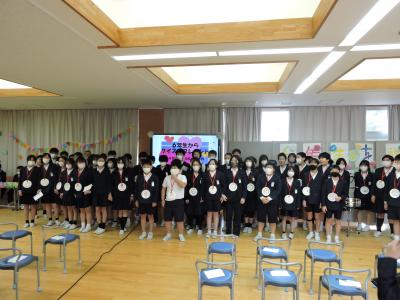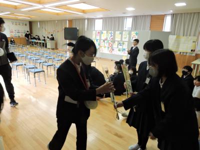 送る会の前に1年生が6年生にメダルのプレゼント