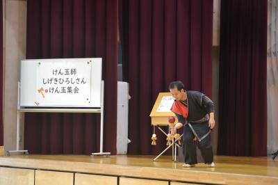 今日は「けん玉師 しげき ひろし」さんをお招きし、全校でけん玉集会 低中高学年に分かれてけん玉検定を行いました。