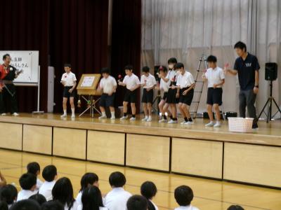 けん玉集会では、しげきさんのパフォーマンスに感激の声があがりました。特に、最後の6個のけん玉のろうそく(玉を入れる)技には、大拍手でした。