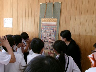 レプリカの掛け軸を前に説明をお聞きし、ますます等伯に興味が高まったようでした。