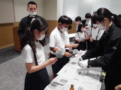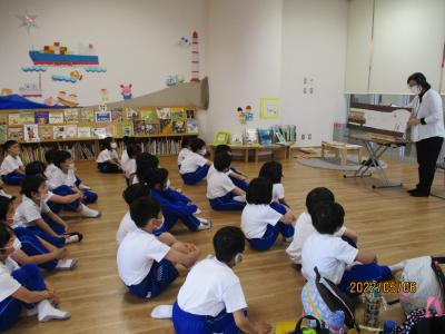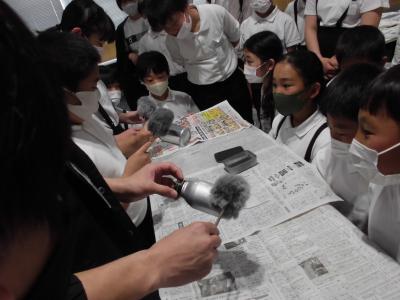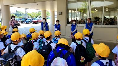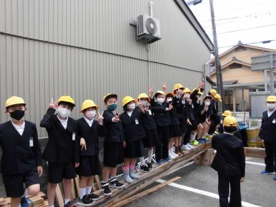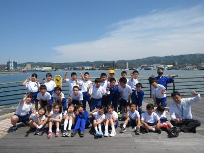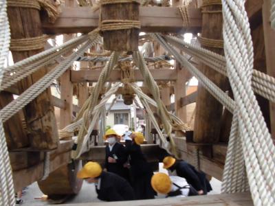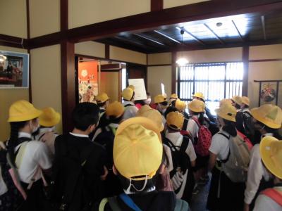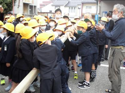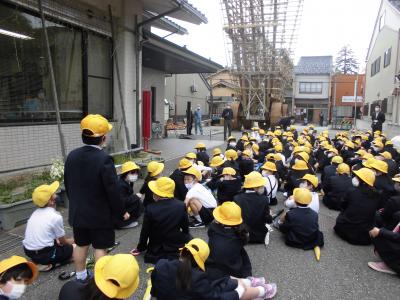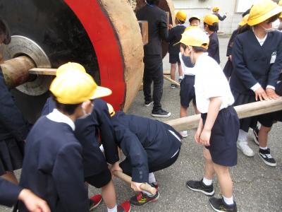 4月26日(火)3・4年生はでか山見学に御祓コミュニティセンターに出かけました。子供達は魚町でか山保存会メンバーの方に、でか山の大きさや重さ、使われている木の種類などを質問したり、てこに触らせてもらったりしました。