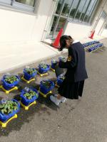 朝、登校時の交通安全指導をしていた時に、前を通った地域の方から、たくさんお花をいただきました。