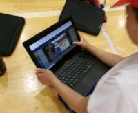1年生が列に並んで順番にタブレットを充電庫から出していました。先日、6年生に教えてもらった通りに、一人一人上手にログイン。そして、カメラで自分のアサガオの芽をカシャっと撮っています。