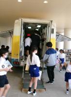 給食時間に、教頭先生と司書の先生お手製の「本とも号での本の借り方」動画を視聴したみんなが、わくわくした顔でピロティに集まってきました。