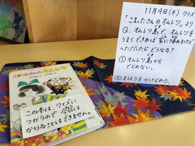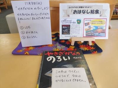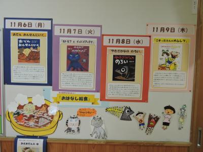 11月6日から9日の1週間、図書とコラボした給食が提供されました。給食の後は、本を見に来る子がたくさんいました。