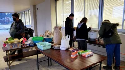 炊き出しボランティアの方々があたたかいお食事を 。