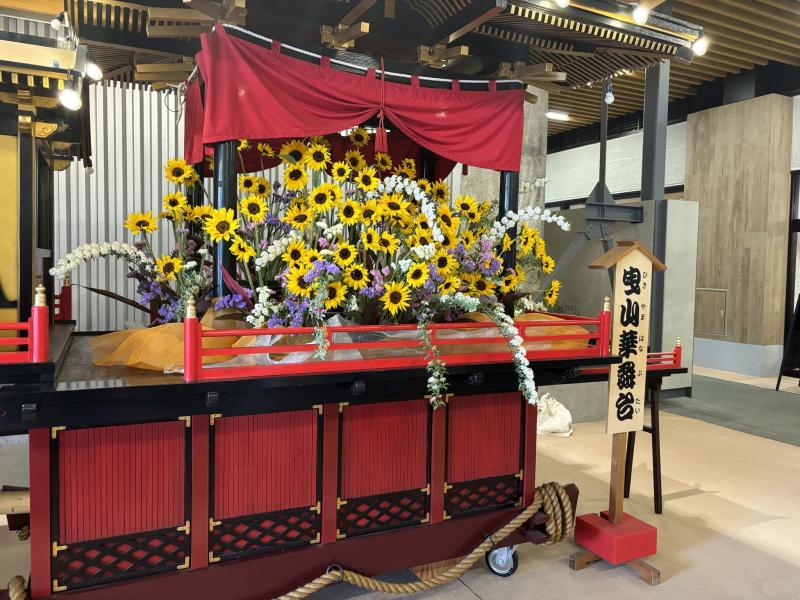 観光交流センター「Komatsu九」の曳山華舞台に、夏らしい向日葵を華やかに生けることができました。