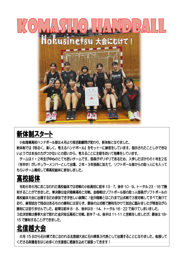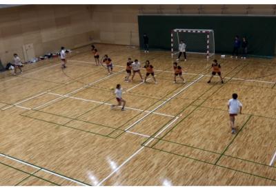 新人大会の予選トーナメント1回戦で小松高校と対戦。両チームともに人数が少なく、よく練習をする相手でもあり、お互いを知り尽くした中での試合でした。結果は22-15と7点差をつけて勝利。予選トーナメントの次戦は金沢商業高校と対戦。前半に14―4と差をつけ、後半も17-5とし、最終的に31-9で勝利。この日、GKは体調不良にもかかわらず、チームのために試合出場を決意し、勝利に貢献してくれました。
