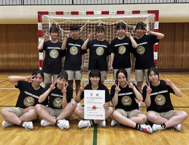 令和7年6月におこなわれた高校総体では、初戦の金沢泉丘高校戦を前半17‐8、後半14‐11、トータル31‐19で勝利。準決勝は金沢商業高校と対戦。金沢商業高校戦は前半15‐12、後半13‐11、トータル28‐23で勝利。決勝戦は小松市立高校と対戦。前半8‐16、後半10‐20、トータル18‐36で残念ながら負けてしまいました。部員が少ない中、新加入の一年生の活躍などもあり、決勝戦まで進めたことは大きな収穫でした。決勝戦まで進めたことは選手の努力はもちろんではありますが、大会でいつも応援に来て下さる保護者の皆様をはじめ、学校関係者の皆様の声援のおかげと感謝しています。今後ともご支援のほどお願い申し上げます。