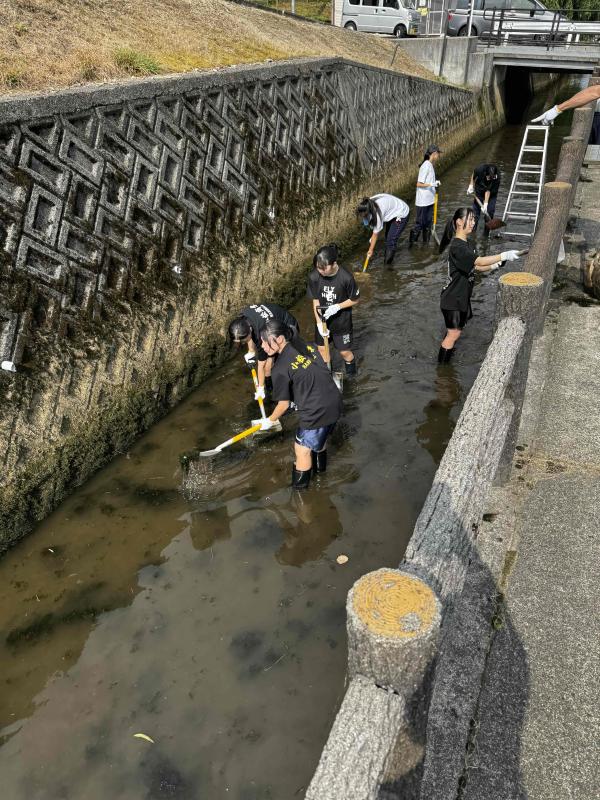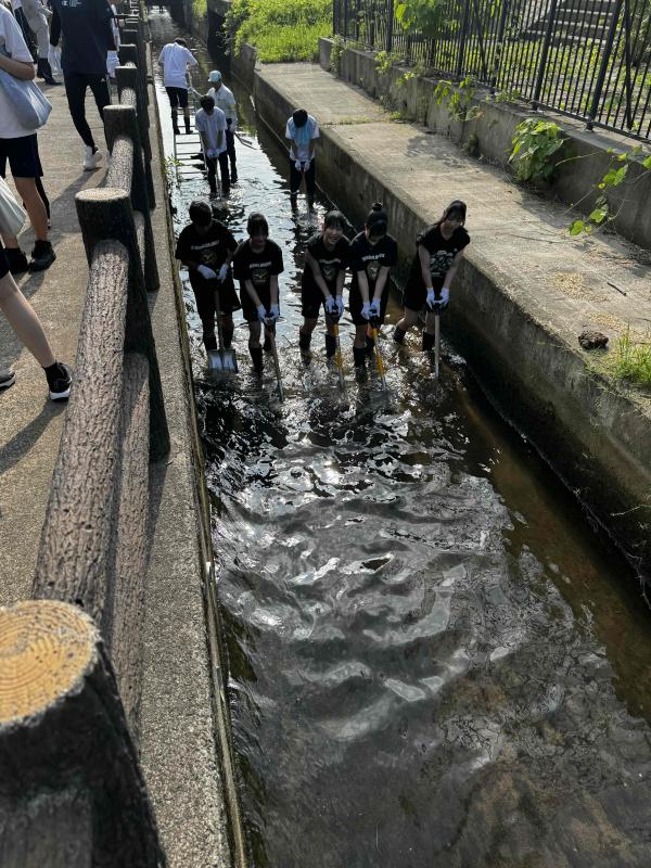 令和7年7月5日(土)早朝8時30分より軽海用水の清掃ボランティア活動に参加。当日は晴天に恵まれ、用水の中に入るのを心配していた生徒達も作業をはじめると楽しそうに活動をしていました。ボランティア活動では積極的に用水内に入り、川底に溜まっている泥や藻などを取り除く作業をしました。泥上げ作業は2時間弱ではありますが、その中で自分は何をすべきかを考えて、進んで行動していました。部活動では試合での勝ち負けも大切ではありますが、地域の人たちから応援されることも大切だと考え、積極的に地域貢献活動にも力を入れています。特に今回のボランティア活動では現役部員の1・2年生だけではなく、北信越大会をもって引退した3年生の先輩たちも駆けつけてくれました。嫌な顔をひとつせずにボランティア活動に参加してくれた選手の皆さんに感謝です!お疲れ様でした。これからもいろいろな人から応援される部活動を目指しましょう!