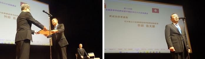 今年度、本校の竹田佐太雄先生が育成功労者表彰を受賞しました!「育成功労者表彰」→高校野球の育成と指導に永年従事され顕著な功労が認められた指導者に対して表彰されるものです。(日本高等学校野球連盟・朝日新聞社)