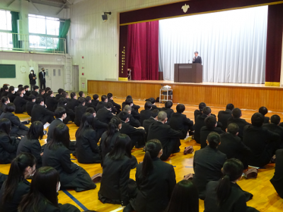 本日、カヌー部の活躍の表彰伝達式を終えた後、令和6年度の終業式が行われました。南校長より、これからの長い人生において、その場・その時々で、”自分の花を咲かせてください”などとお話しいただきました。また、校歌の歌詞に触れ、卒業までの高校生活を清く・秀でし・技能を磨いて卒業していってほしいと、お話しいただきました。