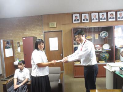 ALTのスターラ先生が退職されることになり、離任式を行いました。本校に7年間勤務され、生徒の英語力向上のために尽力してくださいました。日本語で流ちょうに挨拶されたあと、県からの感謝状・花束を贈呈しました。スターラ先生、長い間小松商業高校の生徒のためにありがとうございました。次のステージでのご活躍をお祈りしています。