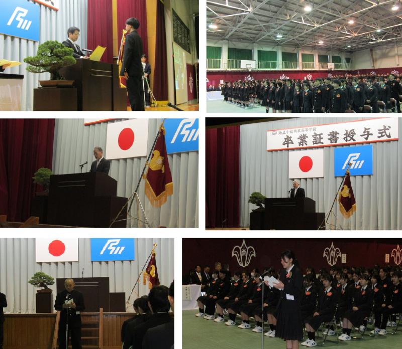 ※本日、卒業証書授与式が執り行われ、南校長より卒業証書が手渡された卒業生144名は本校を巣立っていきました。式では南校長より「挑戦することを恐れないこと」「人とのつながりを大切にすること」「自分を信じること」に加え、「感謝する心を忘れないで!」などといったお言葉をいただきました。また、「いつの日か、できる時でかまいません。能登を助けてください。」と涙ぐみながら卒業生に思いを伝えていました。南校長の式辞の後、来賓を代表して小松商工会議所会頭の西正次様、小松商業同窓会会長の灰田昌典様よりご祝辞をいただきました。式終盤、在校生を代表して2年生の後藤さんが送辞を述べた後、卒業生を代表して藤本さんが答辞が述べました。「後輩や家族、友達に向けて思いを伝えるとともに、これまで多くの方々に支えてもらった分、今度は私たちがこれから出会う人たちに手を差しのべていきたい!」と決意を述べていました。