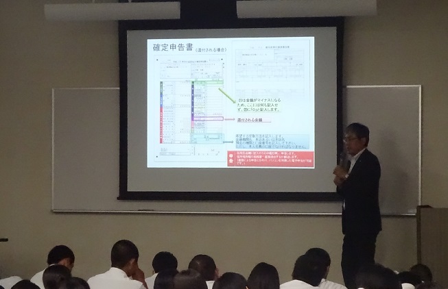※本日、税理士の南一栄氏にお越しいただいて、1年生を対象に「租税教室」が行われました。普段、税について深く考える機会の少ない1年生にとって、意義や役割を理解する良い機会となりました。税理士の南さん、本日は有り難うございまいした。